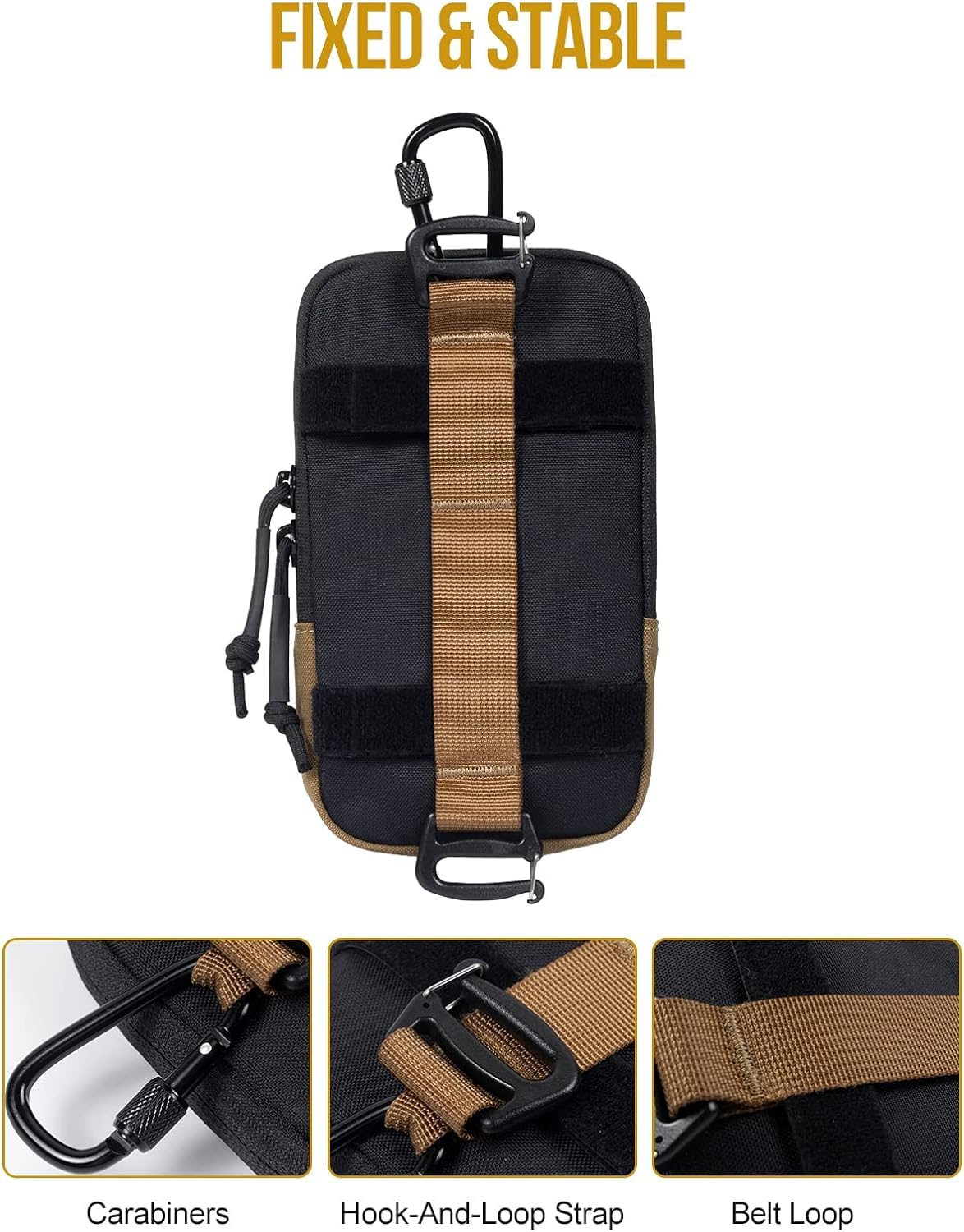 - Easy To Carry: The hook & loop webbing and carabiner allowed attach the tactical phone pouch to the tactical belt, tactical MOLLE backpack, or tactical vest, etc. The vertical webbing on the back of the phone bag provides good stability and will not shake or fall during use