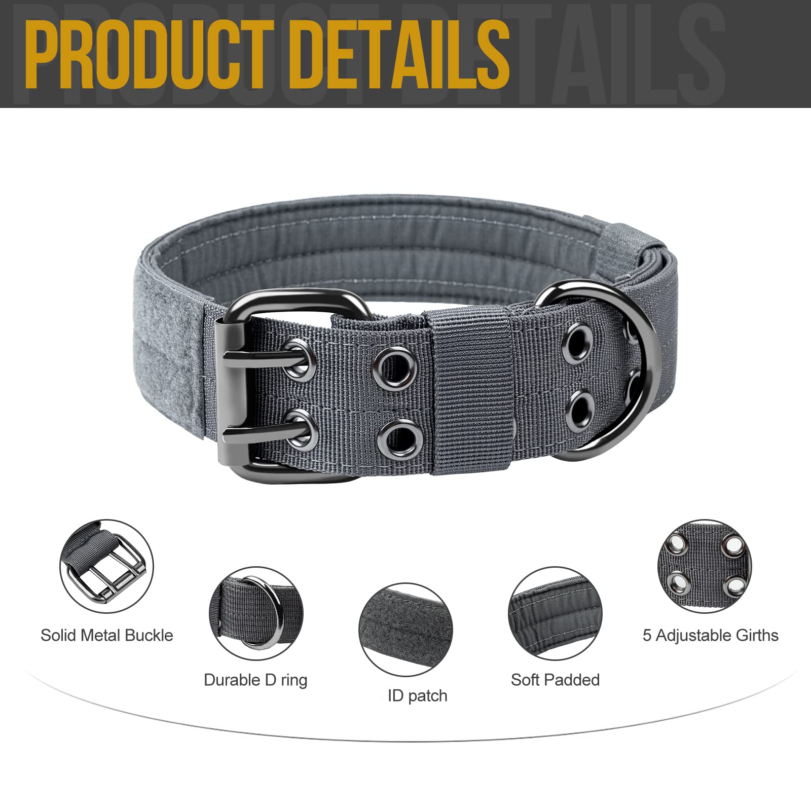 OneTigris Military Adjustable Dog Collar with Metal D Ring & Buckle 2 Sizes (L, Grey)—