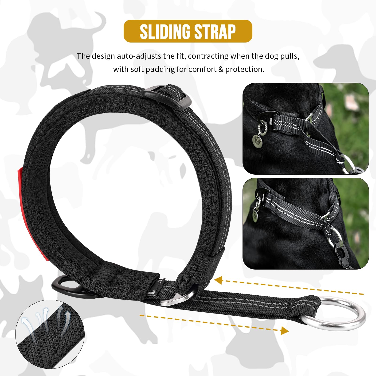 OneTigris No Pull Martingale Dog Collar – Soft Padded Nylon Rope Slip Collar with Reflective Stitching, Adjustable Training Collar for Medium Large Dogs, Black (L)