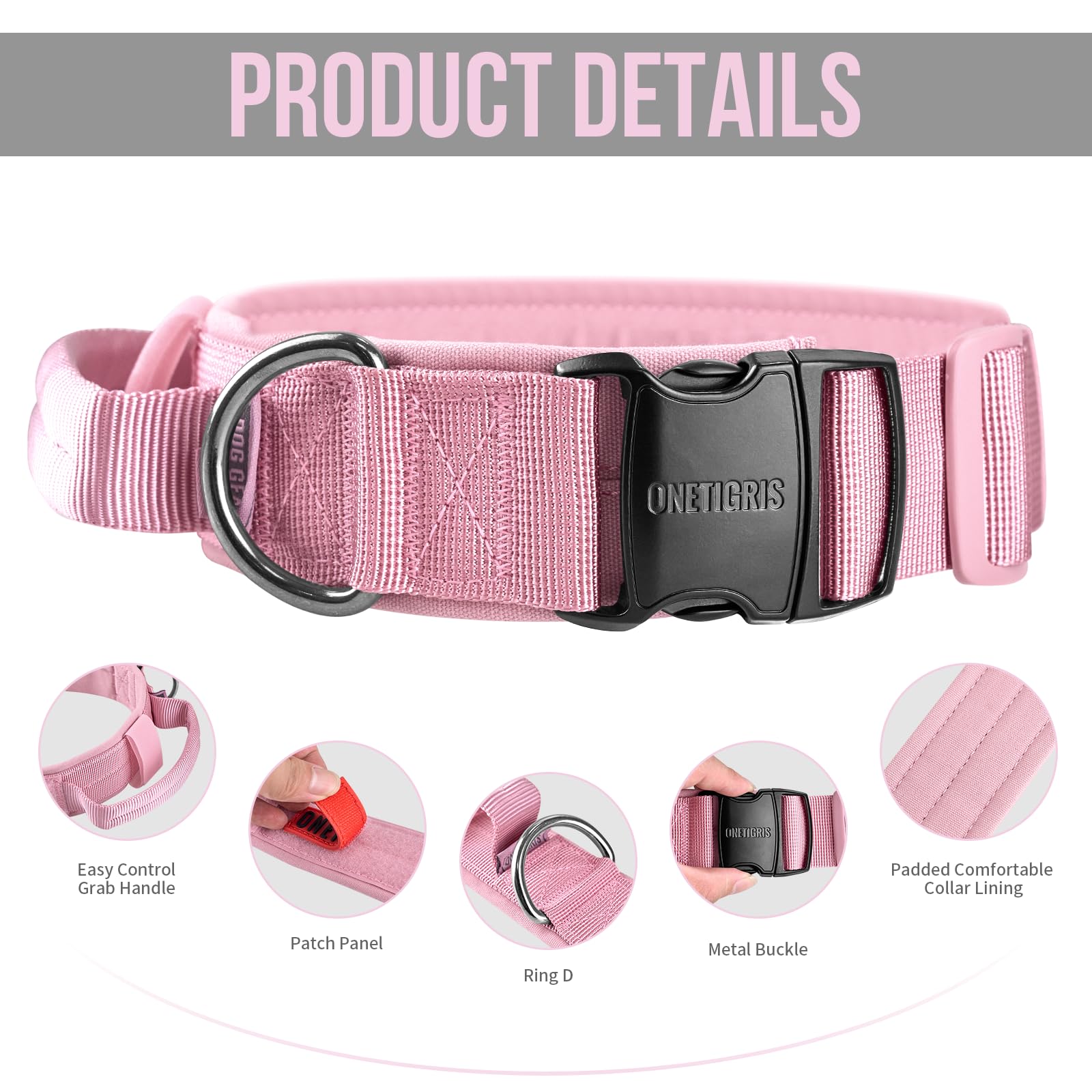 OneTigris Tough Dog Collars, Tactical Dog Collar with Handle, Milltary Adjustable Dog Collar with Heavy Duty Metal Buckle for Training (Large,Pink)